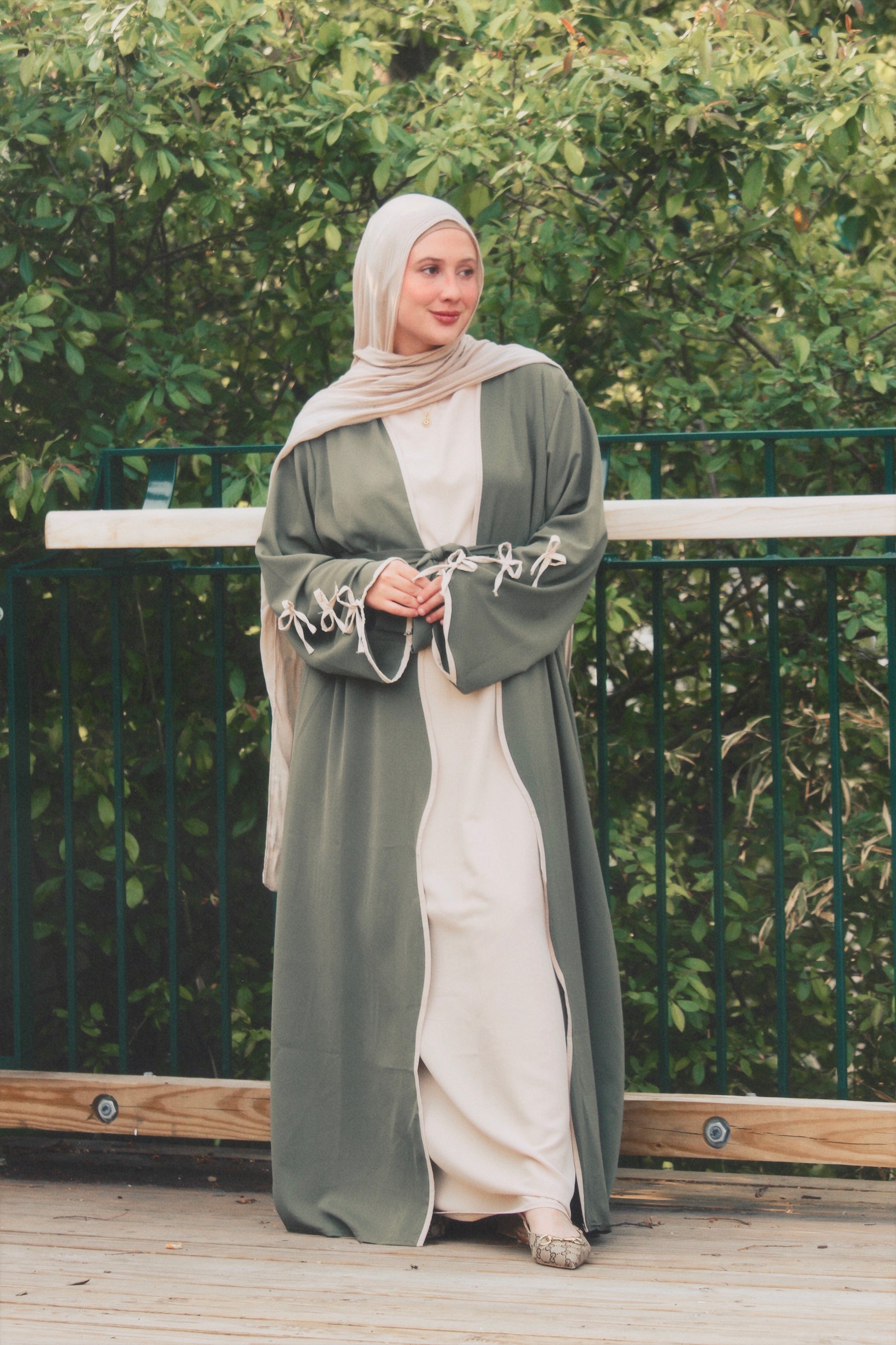 The Nourhan Bow 2-Abaya Set was designed for the woman who carries herself with quiet strength and refined grace. This premium set includes a flowy open abaya and a matching sleeveless underdress — offering an effortless layered look that moves with you.